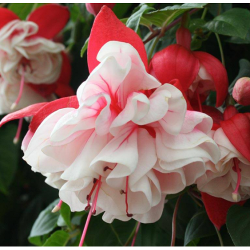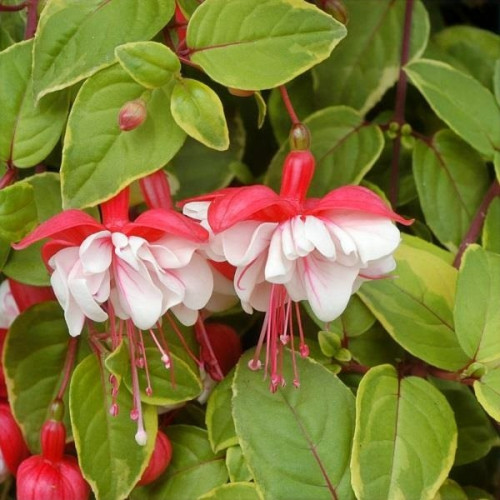 General Information: Cascades of pendulous red and white blooms cover dark green foliage